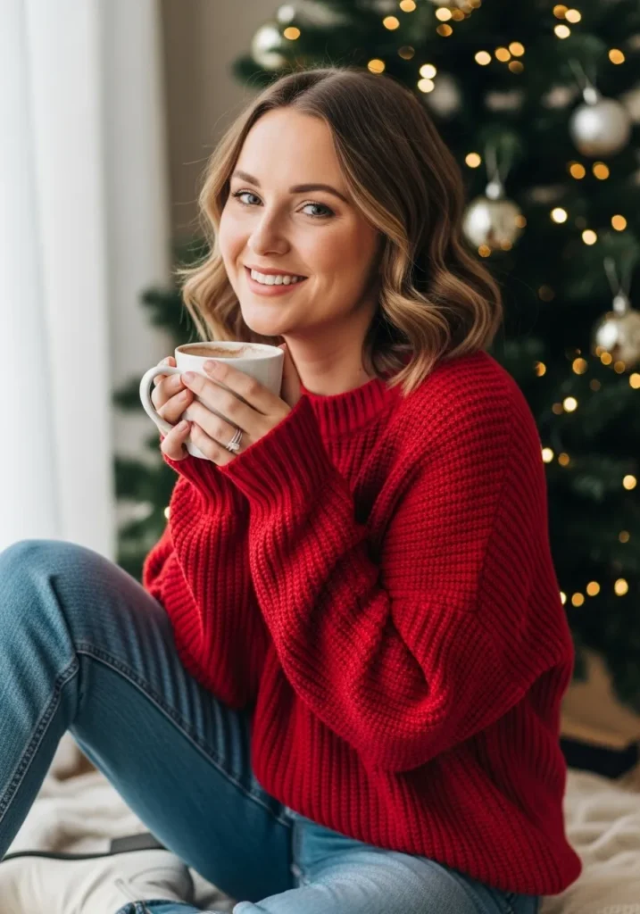 Nothing says Christmas coziness quite like a chunky red knit sweater paired with classic blue jeans. The soft, oversized texture of the sweater gives off that perfect balance of warmth and relaxed charm, while the fitted denim keeps the look grounded and flattering. With her hair softly waved and a mug of cocoa in hand, the whole outfit feels effortlessly festive, especially against the glow of a twinkling tree in the background.