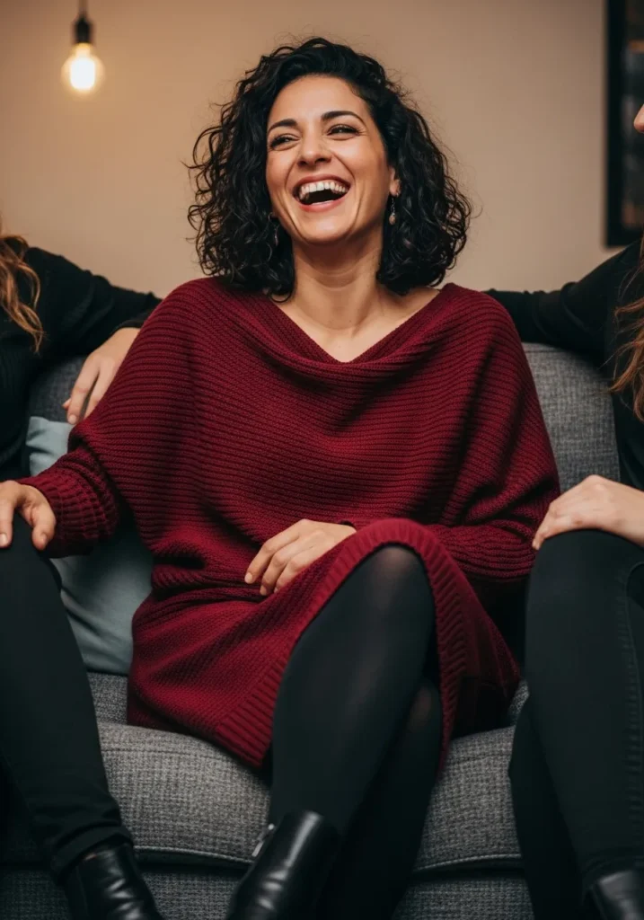 This look captures that perfect mix of cozy and classy with a chunky knit sweater dress in deep burgundy that drapes beautifully and feels like a warm hug. The relaxed neckline adds a soft, flattering touch, while black opaque tights and sleek ankle boots pull the outfit together with a little edge. The overall vibe is cheerful yet polished, like you’re ready to sip mulled wine and laugh through the night without ever feeling overdressed.