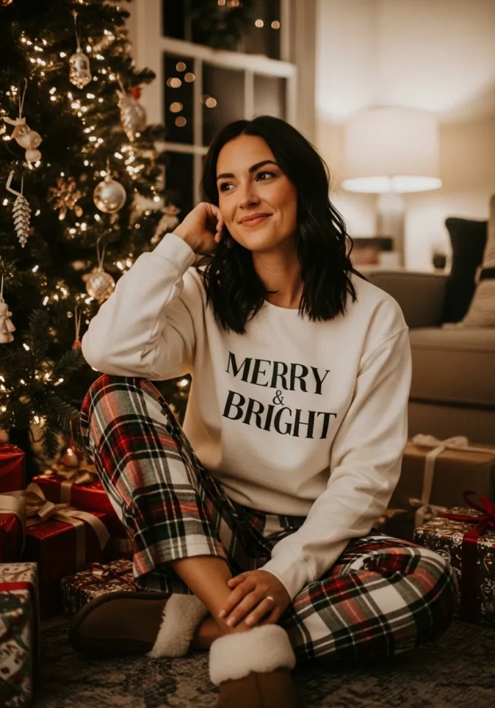 This outfit captures the perfect mix of cozy and cute with its soft white sweatshirt printed with “Merry & Bright,” paired with classic red and green plaid pajama pants. The relaxed fit makes it feel effortlessly comfortable, while the fluffy brown slippers add that extra touch of warmth and charm. The setting by the Christmas tree with soft lighting makes the whole look feel like a warm hug wrapped in twinkle lights.