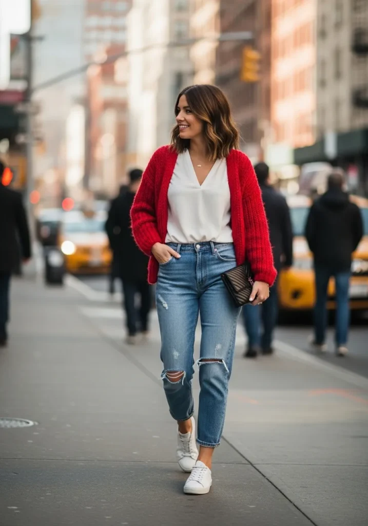 This look is the perfect mix of cozy and cool. She’s wearing a soft red chunky knit cardigan over a crisp white blouse, paired with slightly distressed blue jeans that hit just above the ankle. White sneakers keep things casual and comfortable, while a small quilted black clutch adds a touch of polish. The whole outfit feels easy-going yet pulled together, like she just stepped out for coffee and somehow looked effortlessly stylish doing it.