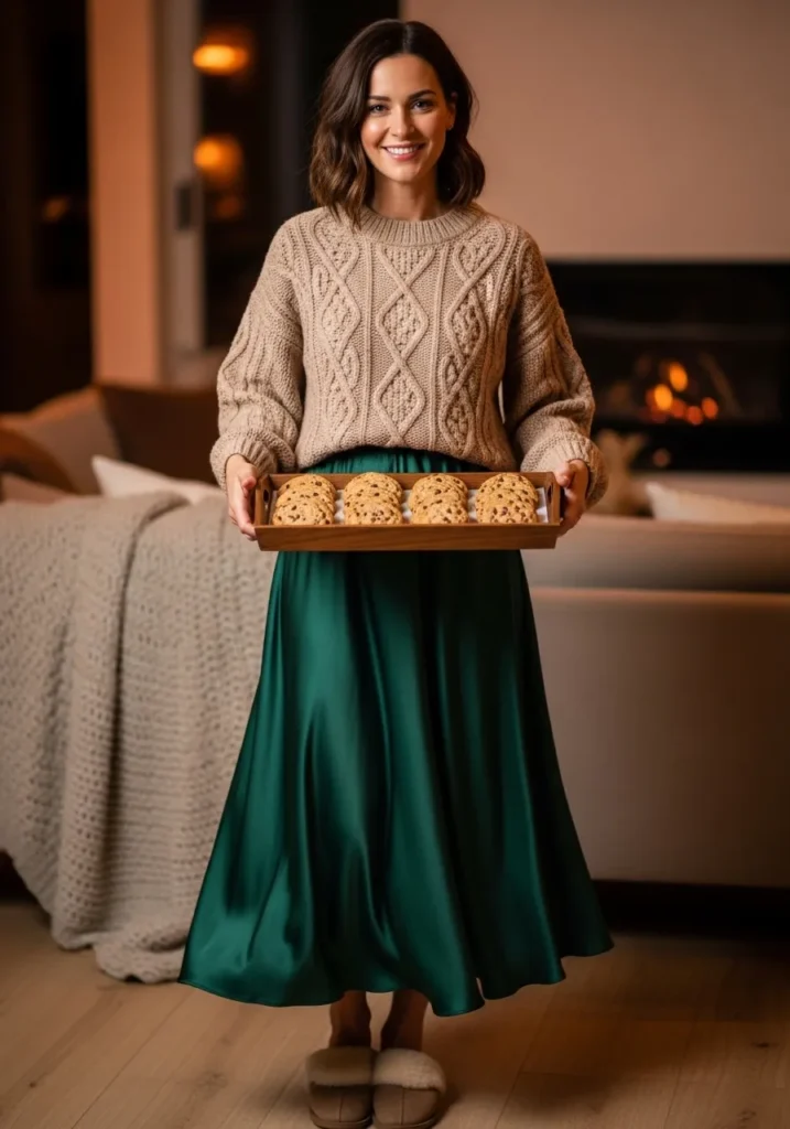 This outfit is the perfect mix of cozy and chic. The soft beige cable-knit sweater brings all the comfy winter vibes, while the emerald green satin skirt adds just the right touch of festive elegance. The textures balance each other beautifully—the chunky knit feels relaxed and homey, and the satin catches the light with every move. Paired with fuzzy slippers and a warm smile, it’s giving hostess with the mostess energy in the best possible way.