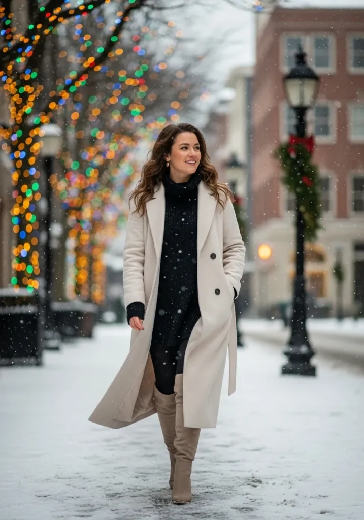 This outfit perfectly balances warmth and elegance for a snowy winter stroll. She’s wearing a soft cream longline wool coat layered over a cozy black turtleneck sweater dress. The mix of textures makes the whole look feel expensive without trying too hard. Black tights and over-the-knee suede boots in a taupe shade add both structure and comfort, while the subtle gold hoop earrings and wavy hair give that effortless “I just stepped out for cocoa” vibe. The softly falling snow and twinkling Christmas lights complete the scene like a holiday movie moment.