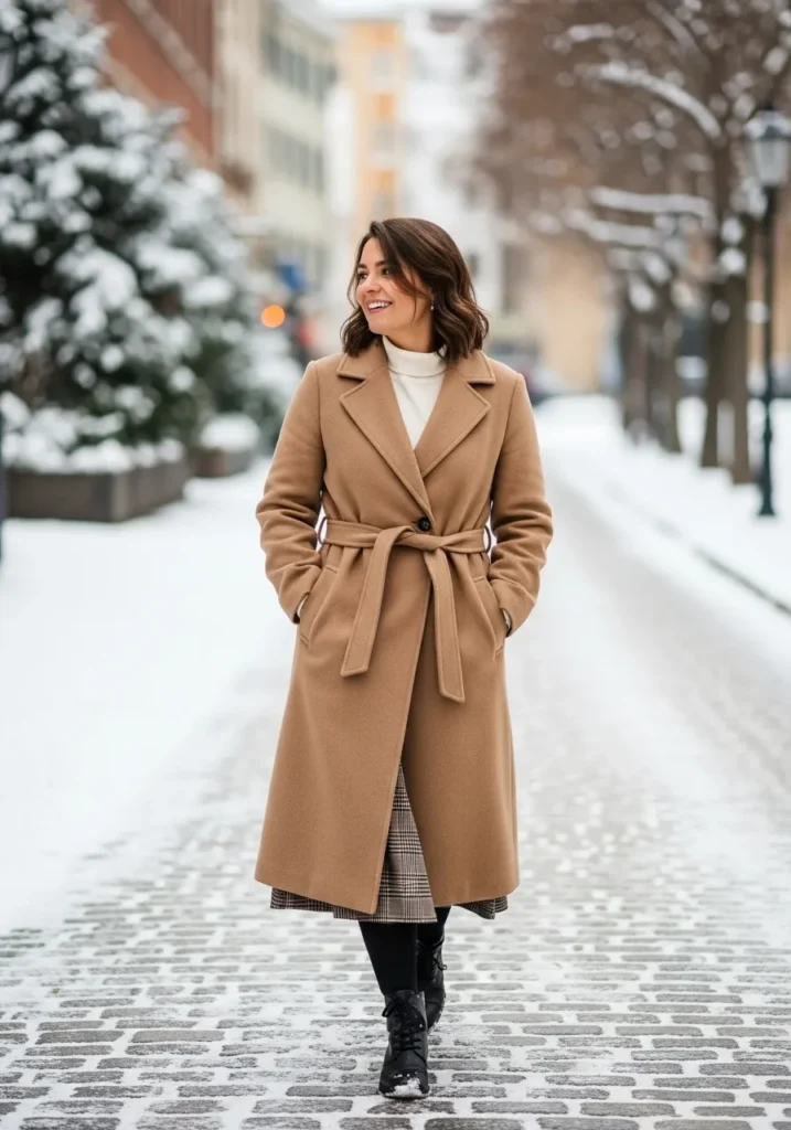 This outfit is the definition of timeless winter elegance. A tailored camel wrap coat ties neatly at the waist, creating that effortlessly feminine silhouette we all love. Underneath, a peek of plaid skirt adds just the right touch of pattern, keeping things interesting without stealing the show. The look is grounded with sleek black tights and sturdy lace-up boots—perfect for walking through a snowy city street while still looking put-together. The creamy turtleneck peeking out from the coat softens the look and adds cozy contrast against the rich camel hue.