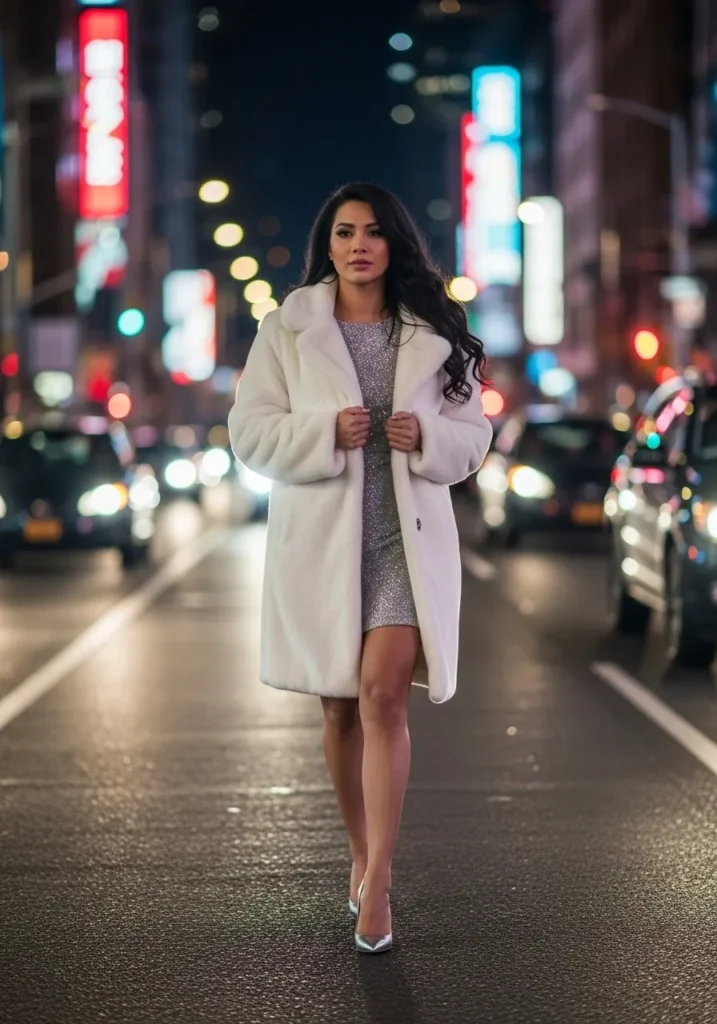 This outfit is pure winter glamour in motion. A shimmering silver mini dress catches the city lights with every step, while a plush white faux fur coat adds that cozy-but-luxe contrast every holiday outfit dreams of. The silver stilettos tie everything together, reflecting the glow of the night like tiny disco balls. It’s the kind of look that turns a regular city street into your own holiday runway.