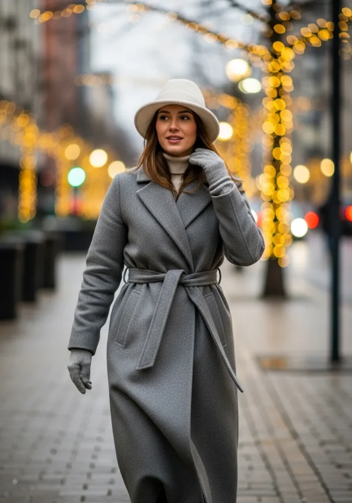 This outfit is pure sophistication with a cozy twist. The woman is wearing a long, tailored gray wool coat tied neatly at the waist, paired with soft matching gloves and a light beige turtleneck peeking through. The neutral tones keep everything looking sleek and effortless, while the wide-brimmed cream hat adds a touch of quiet luxury that feels straight out of a holiday movie. The background of softly glowing city lights makes the entire look feel timeless and impossibly chic.