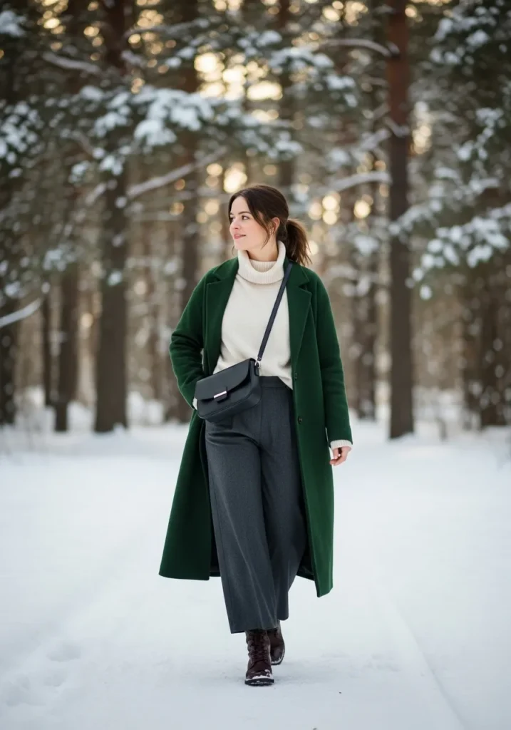 This outfit perfectly balances warmth and sophistication with a dark green wool coat that instantly adds depth and richness to the winter backdrop. Underneath, a soft ivory turtleneck sweater peeks out, cozy yet polished against tailored charcoal-gray wide-leg trousers. The structured black crossbody bag ties it all together, while brown lace-up boots keep things practical for a snowy stroll. It’s that kind of look that whispers “effortless chic” instead of shouting it.
