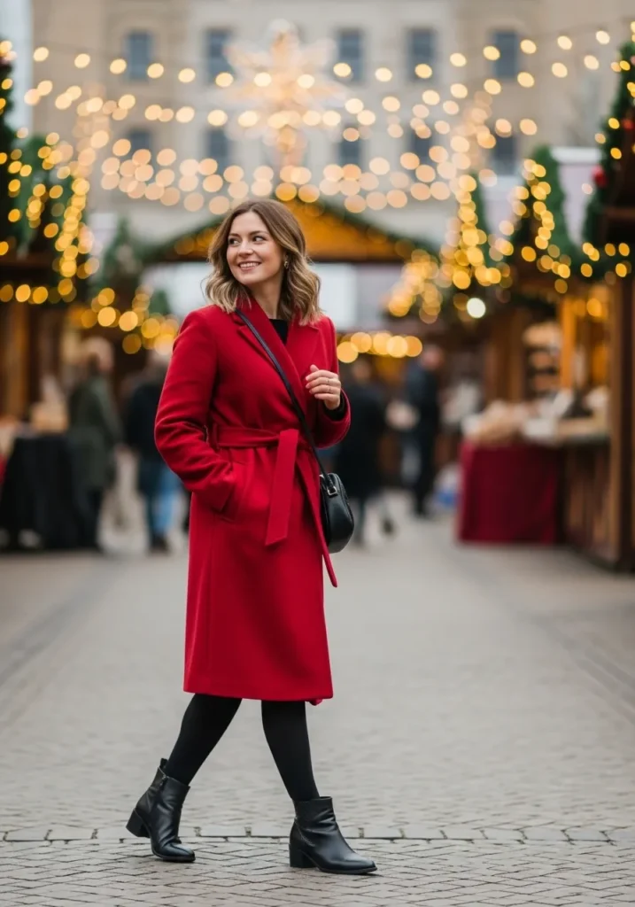 I love how this outfit captures the spirit of the season without trying too hard. The red coat feels bold but classic, while the scarf softens it with cozy winter charm. It’s flattering because of the defined waist and sleek accessories, yet still totally comfortable for a chilly evening stroll past twinkling store windows. Honestly, if I could wear just one outfit to feel instantly festive and put-together, this would be it.