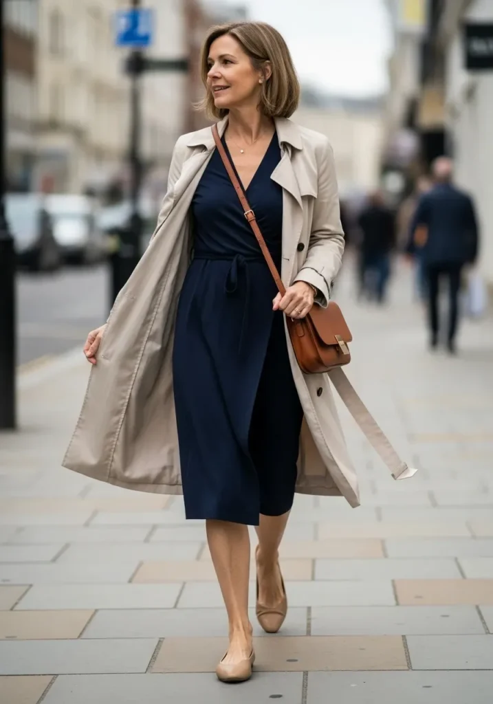 This outfit pairs a soft navy wrap dress with a light beige trench coat for the kind of polished look that always feels right for church. The fabrics look flowy and comfortable, and the neutral tones keep everything elegant without trying too hard. The crossbody bag brings in a warm brown accent and the nude flats keep the whole look effortless and easy to move in. The vibe is refined, simple and very put together.