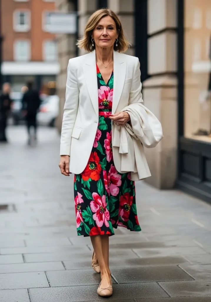 This outfit is a gorgeous mix of bold and classic. The floral midi dress brings in vibrant bright blooms that feel joyful and eye catching and pairing it with a clean white blazer instantly elevates the whole look. The structured blazer adds polish while the floral print keeps the outfit fun and feminine. Neutral flats finish the outfit with an easy comfortable touch.