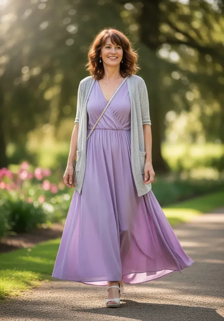 This look pairs a dreamy lavender maxi dress with a simple gray cardigan for the kind of outfit that feels romantic but still easy. The dress has a soft flow that moves beautifully and the wrap neckline brings in a flattering touch without feeling too formal. The cardigan adds just enough warmth and the white sandals keep everything light and fresh. The color palette feels soft gentle and perfect for spring.