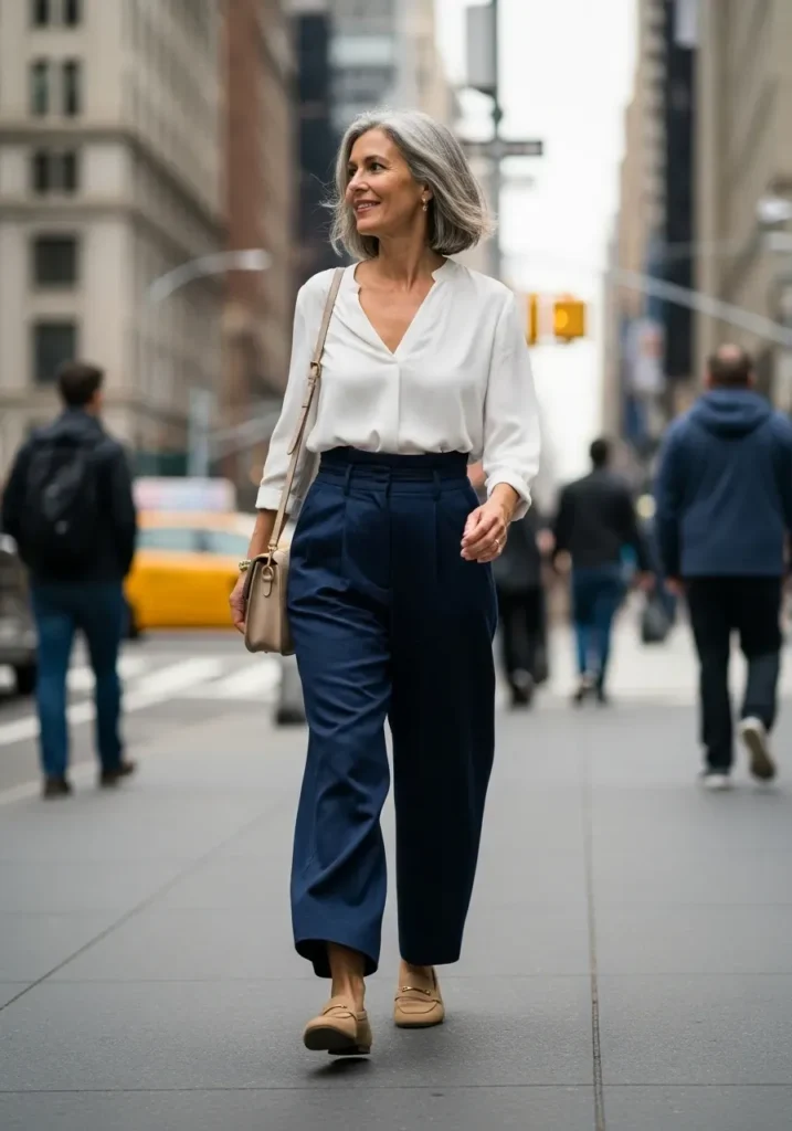 There’s something so classic about the combination of a clean white blouse and tailored navy trousers. The blouse feels soft and breezy and the pleated high waist trousers give the outfit such a beautiful structure. Paired with neutral loafers and a beige shoulder bag the look stays polished without feeling stuffy. It’s simple timeless and very put together.