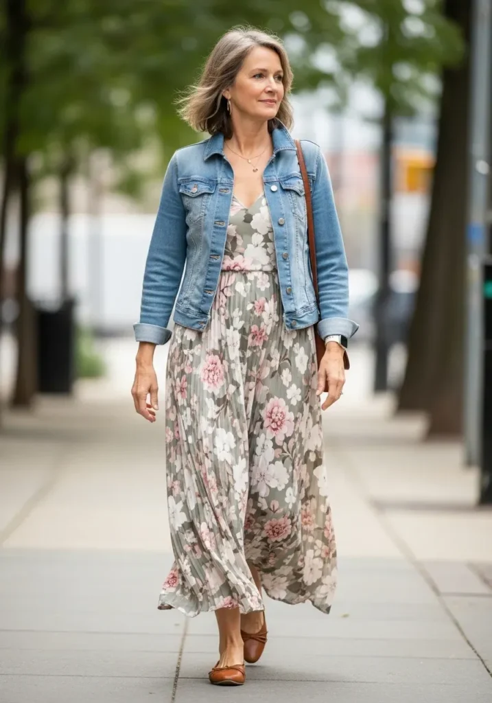 This floral maxi dress brings in soft pink and gray tones that feel feminine and soothing. The pleated fabric gives the skirt a beautiful swishy movement and the denim jacket adds the perfect casual layer. Brown flats keep the outfit practical and grounded and the whole look feels relaxed graceful and easy to style.