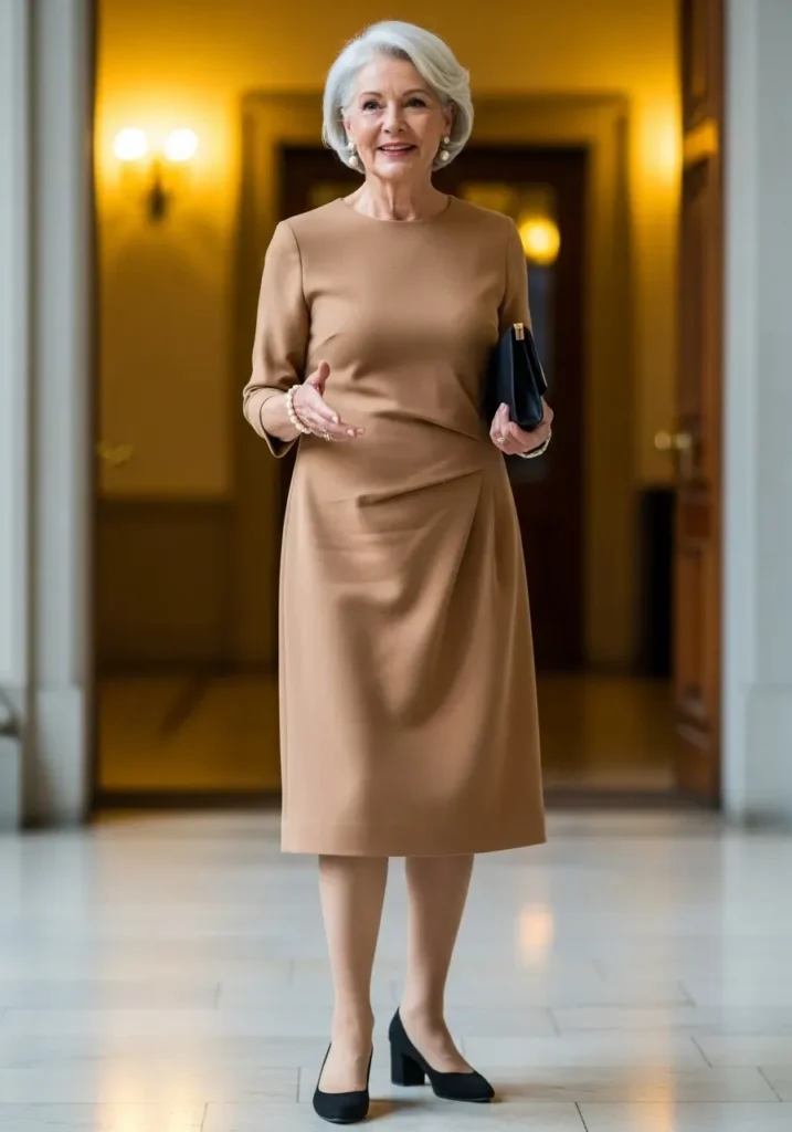 This camel midi dress is all about clean lines and thoughtful details. The fabric has a smooth refined finish and the soft draping at the waist adds shape without drawing too much attention. Paired with classic black heels and a matching clutch the outfit feels timeless and sophisticated. The overall look is polished neutral and so elegant.