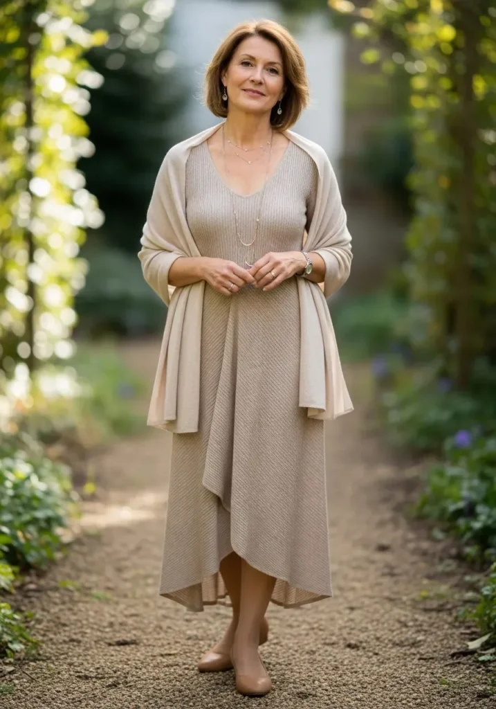 This soft neutral dress is pure elegance in the most relaxed way. The ribbed texture adds a hint of interest and the asymmetrical hem makes the silhouette feel modern and graceful. The matching shawl drapes beautifully and adds warmth without feeling bulky. Nude heels finish the outfit with a clean polished touch. The overall look is serene soft and timeless.