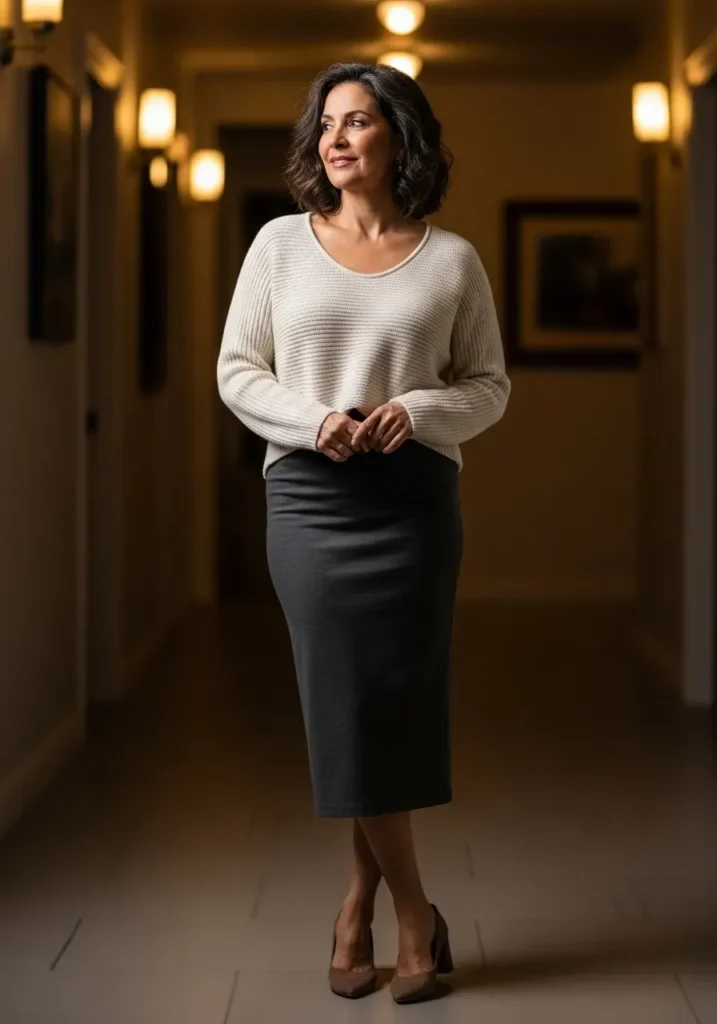 This look mixes a softly textured cream sweater with a fitted charcoal midi skirt for a cozy yet refined feel. The knit top adds warmth and comfort while the skirt creates a long clean line that feels very flattering. Neutral heels tie the outfit together and bring a touch of elegance without overdoing it. The overall vibe is soft classic and polished.