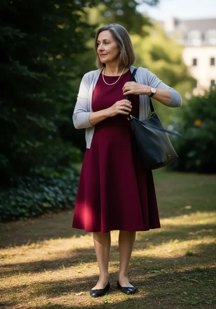 A rich burgundy dress instantly looks elegant and pairing it with a light gray cardigan makes the whole look so soft and approachable. The dress has a lovely flow to it and the midi length feels modest yet stylish. Black flats and a structured bag keep the outfit practical and polished. The vibe is ladylike and timeless.