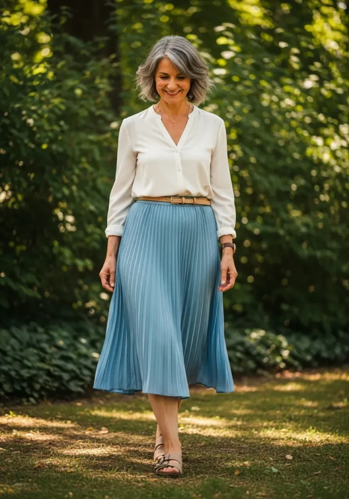 This outfit pairs a soft blue pleated midi skirt with a crisp white blouse for a look that feels light airy and beautifully feminine. The pleats add movement and elegance while the blouse keeps everything classic and neat. A tan belt and matching sandals warm up the outfit and pull everything together. The overall vibe is graceful and charming.