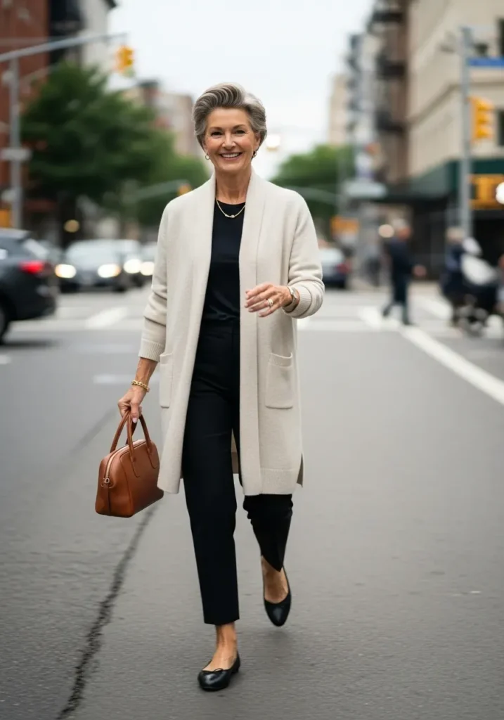 This outfit blends comfort and polish in the best possible way. A long cream cardigan drapes softly over a black top and tailored black trousers creating a clean simple silhouette that still feels elevated. The textures are cozy without being heavy and the warm brown bag adds a touch of richness to the look. Black flats keep everything practical for walking and standing. The vibe is minimal chic and very grown up.