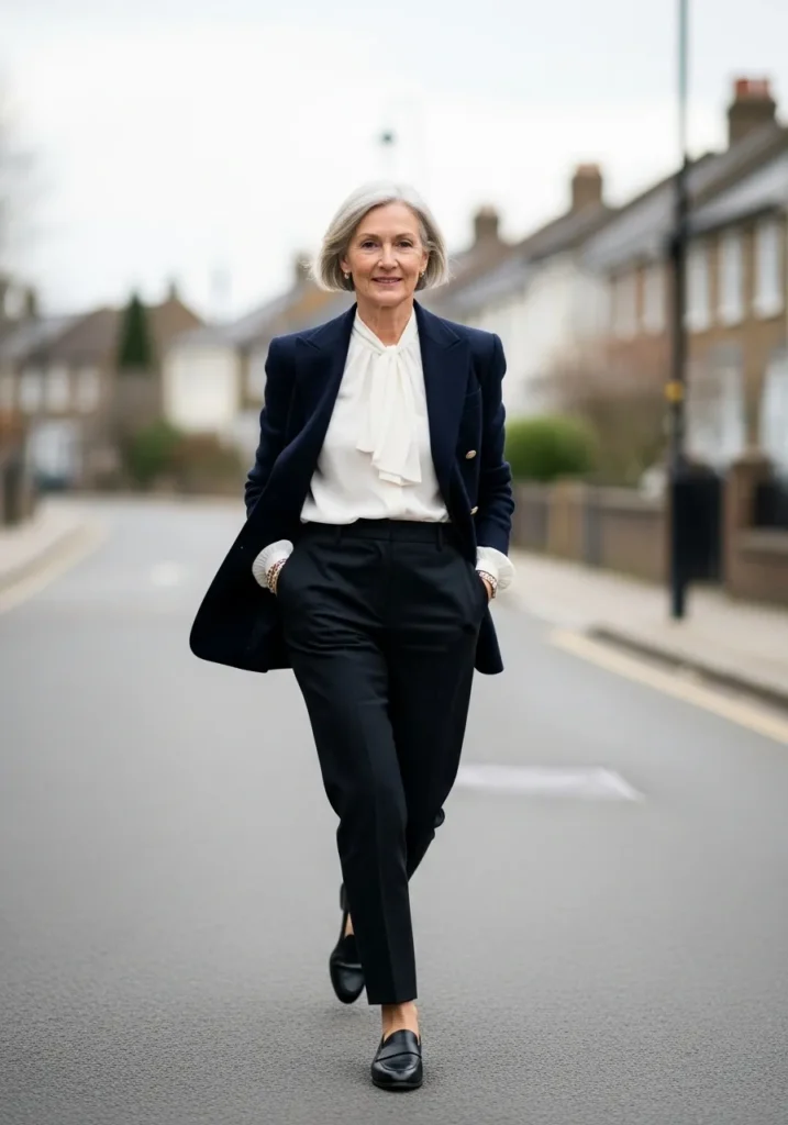 The look brings together a crisp cream blouse with a soft tie detail, a sharp navy blazer, and a pair of tapered trousers that sit beautifully at the waist. The loafers keep everything clean and structured. The outfit feels refined yet easy with fabrics that move well and hold their shape. The mood leans timeless and confident.
