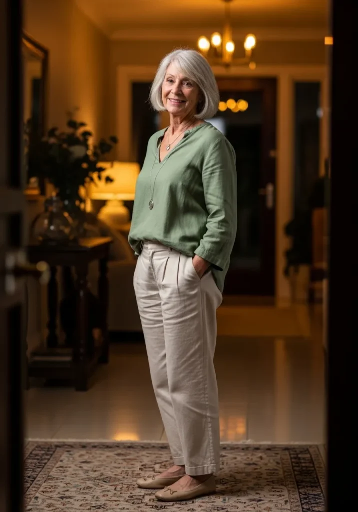 The gentle green blouse drapes in a relaxed way and adds a calming tone. The light trousers bring in a soft neutral base with a comfortable cut. The ballet flats keep the outfit easy and understated. The necklace adds a little sparkle without feeling too bold. Everything blends into a peaceful, effortless look.
