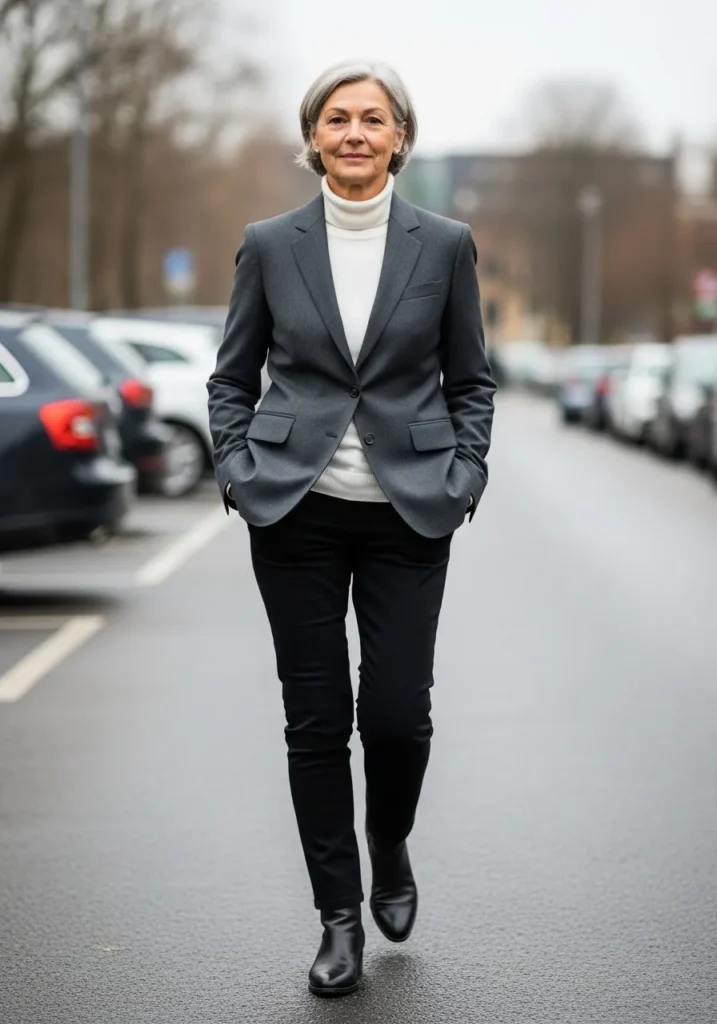 The gray blazer adds clean structure with its tailored shape. The white turtleneck underneath feels smooth and minimal. Dark trousers complete the outfit with a simple refined line. Black ankle boots add a touch of strength. The whole look feels modern and composed.