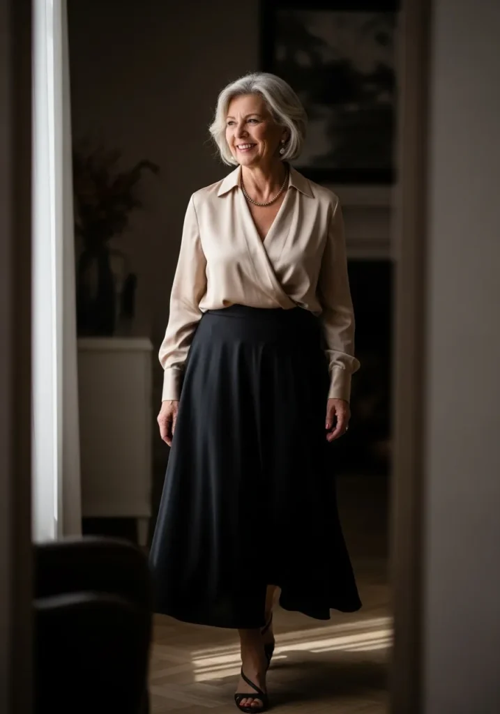 Satin Wrap Blouse With a Flowing Black Midi Skirt