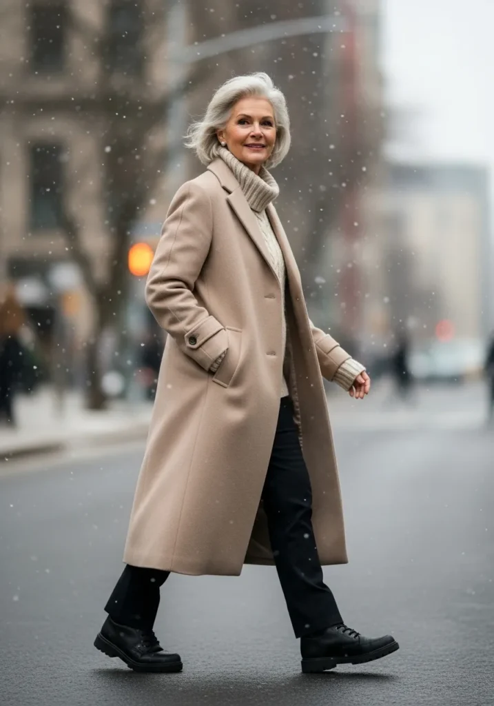 The long camel coat feels warm and refined with its classic shape and soft wool texture. Underneath, the chunky turtleneck sweater adds comfort and a lovely bit of winter charm. Dark trousers and sturdy black boots balance the softness with something grounded. The whole look feels practical yet stylish on a snowy day.