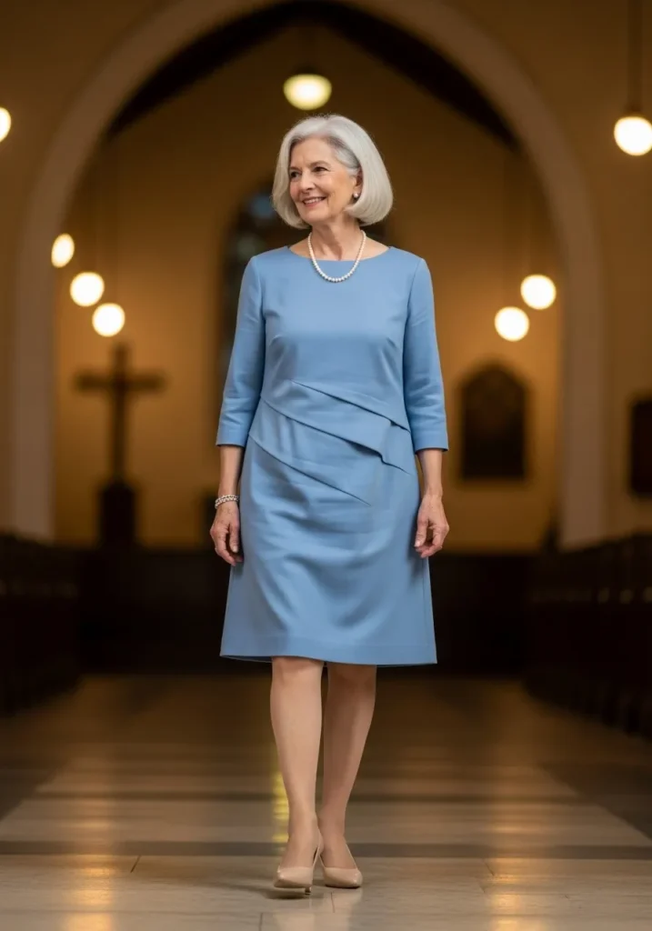 The light blue dress has a simple shape that feels clean and smooth, with layered draping that adds a quiet bit of interest. The three quarter sleeves keep everything modest and classic. Nude heels and pearls bring the outfit together with a soft, timeless finish. It feels graceful and serene.