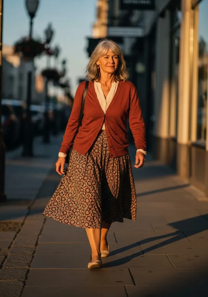 The patterned skirt brings fun movement with its flowy fabric and soft print. The cream blouse underneath keeps the look light while the rust cardigan adds warmth and depth. Neutral flats complete the outfit in a relaxed way. Everything feels charming and approachable.