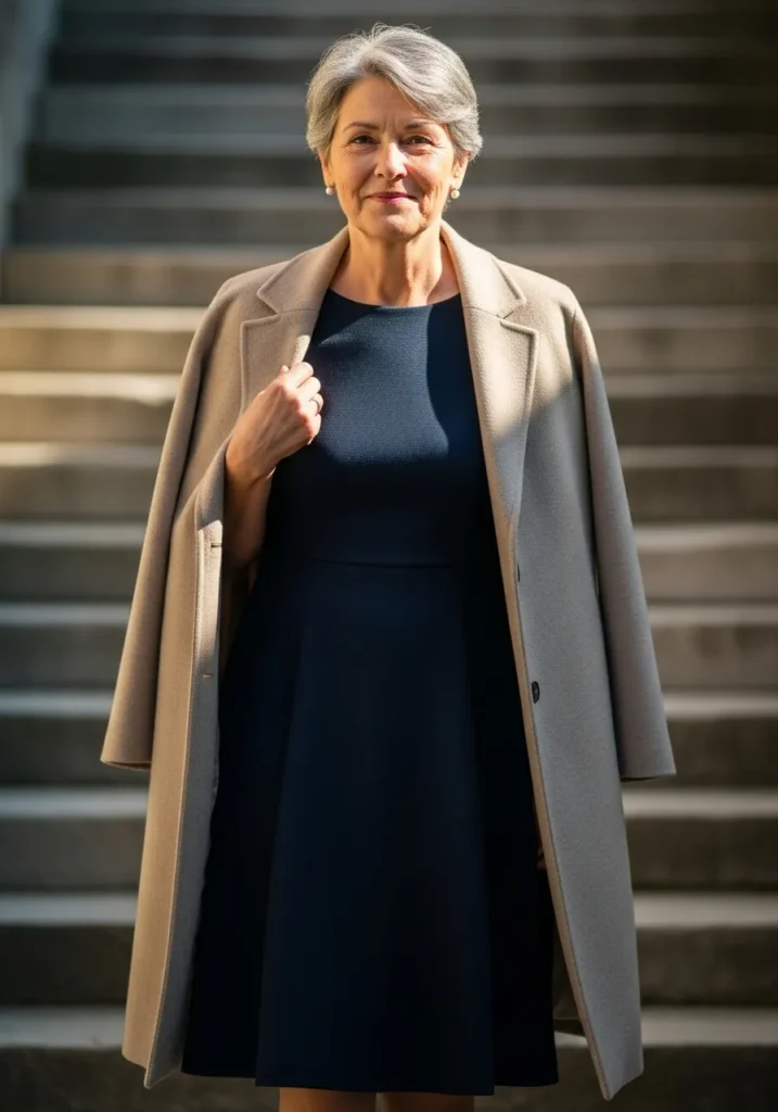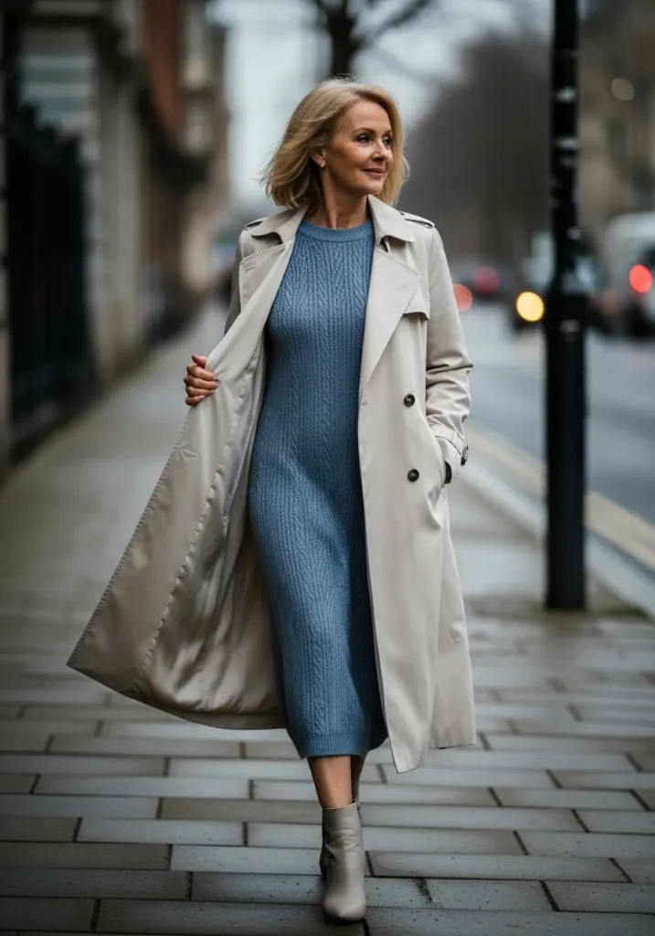 I like the balance here because the knit dress feels cozy while the trench adds polish. The shape stays simple which keeps the whole look graceful. It is one of those outfits that helps me feel stylish and warm at the same time.