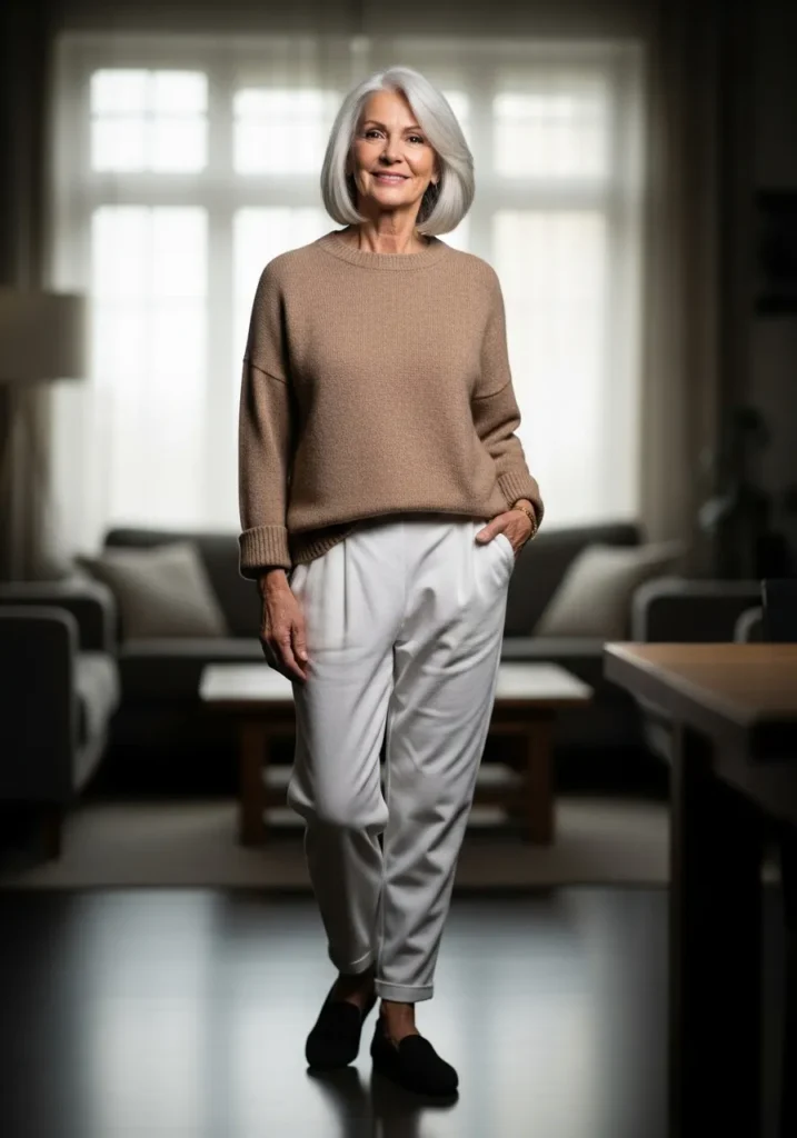 Cozy Neutral Sweater With White Trousers