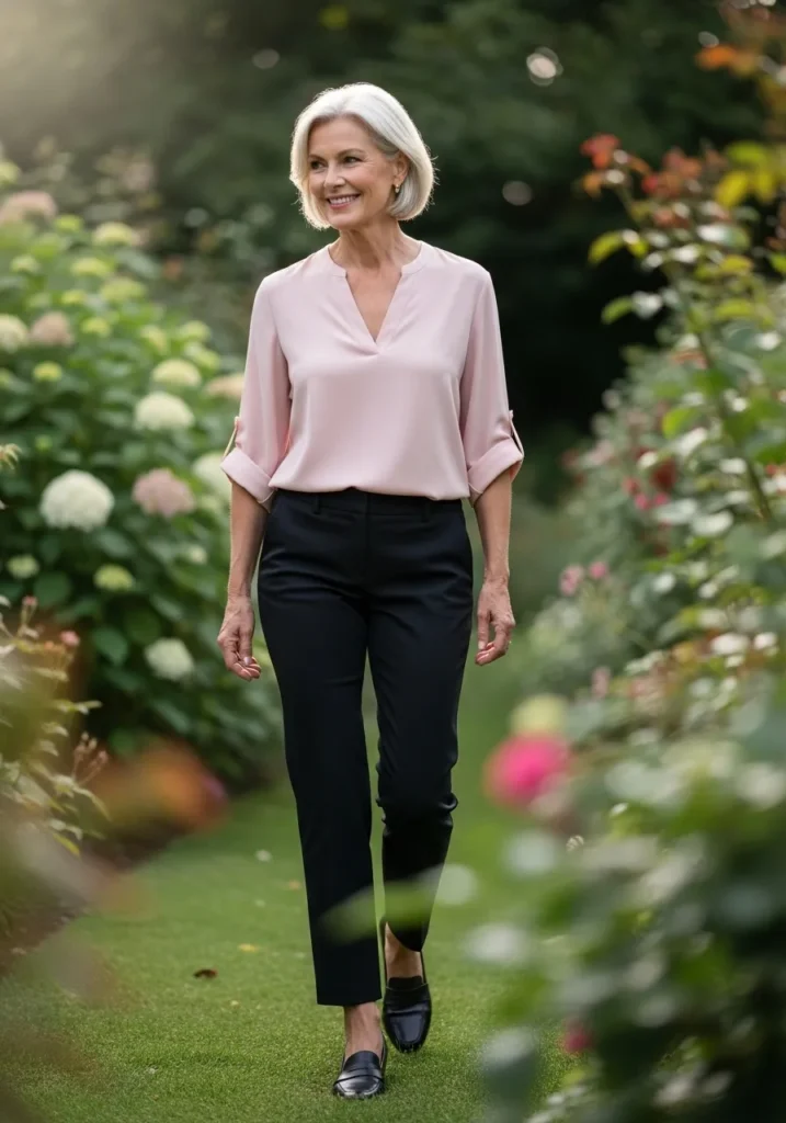 Blush Blouse With Sleek Black Trousers