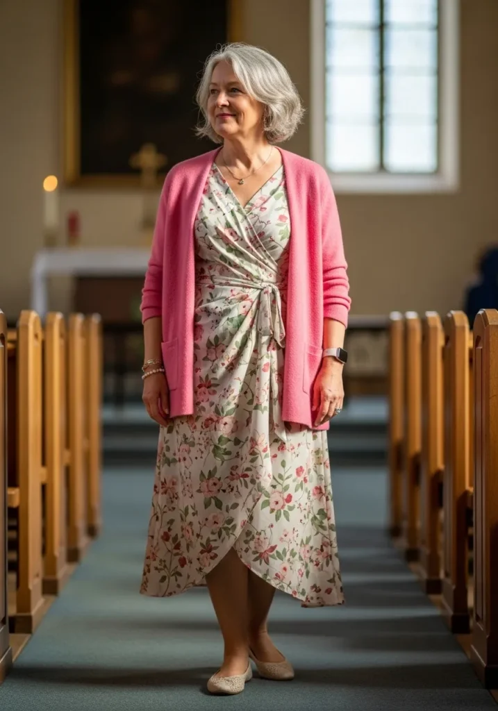 The wrap dress features a gentle floral print in muted tones and falls to a graceful midi length. A plush pink cardigan adds warmth and softness while keeping the look charming and relaxed. Light flats finish everything with comfort. The outfit feels airy and cheerful with fabrics that drape nicely.