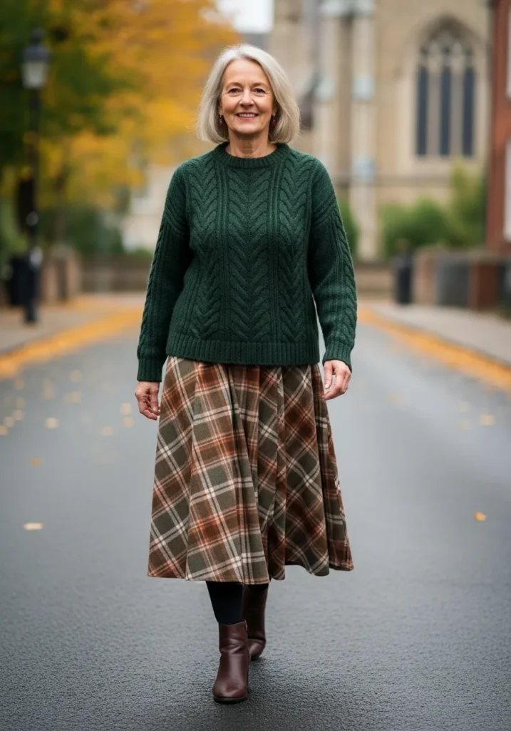 The deep green sweater feels cozy and rich with its chunky knit texture. The plaid skirt brings warm autumn tones and a flowy silhouette that moves beautifully. Dark tights and brown ankle boots add comfort and keep things grounded. The entire outfit has a charming seasonal feel.