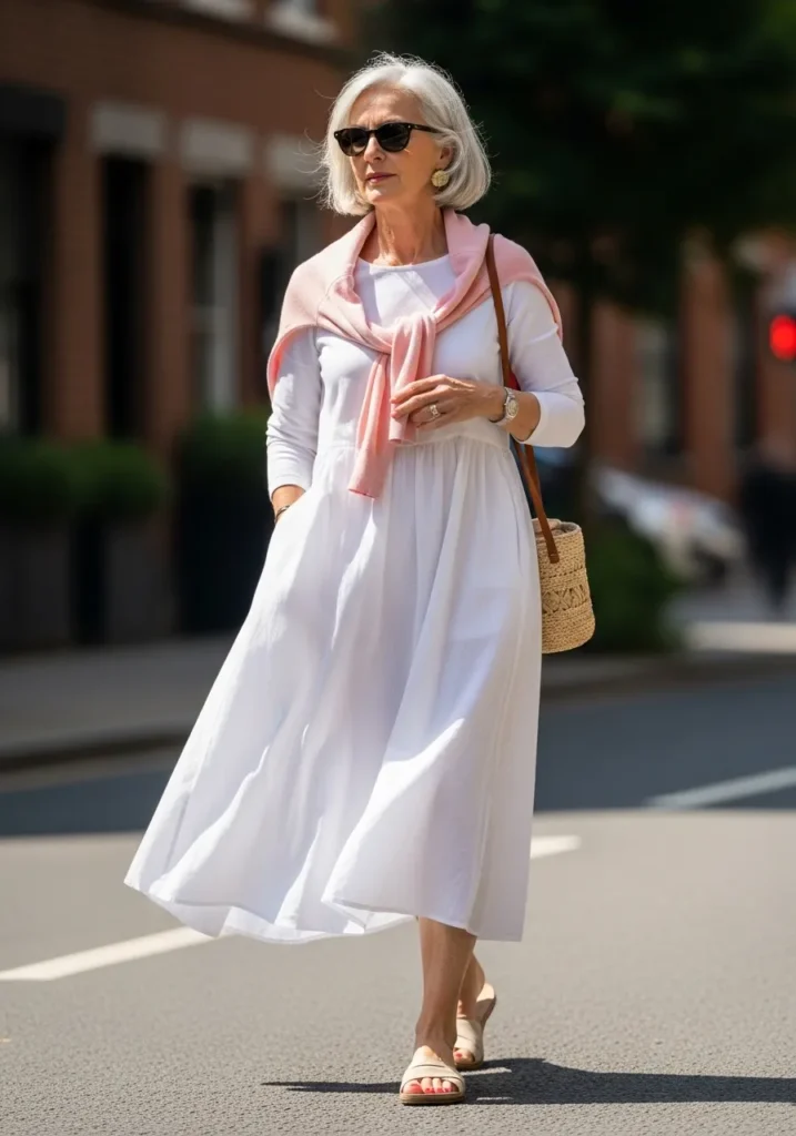 The white dress falls in a soft, airy shape that feels fresh and light. A pastel sweater draped around the shoulders adds color and a bit of charm. Sandals and a woven bag keep the outfit breezy and relaxed. The whole look feels bright and easy.