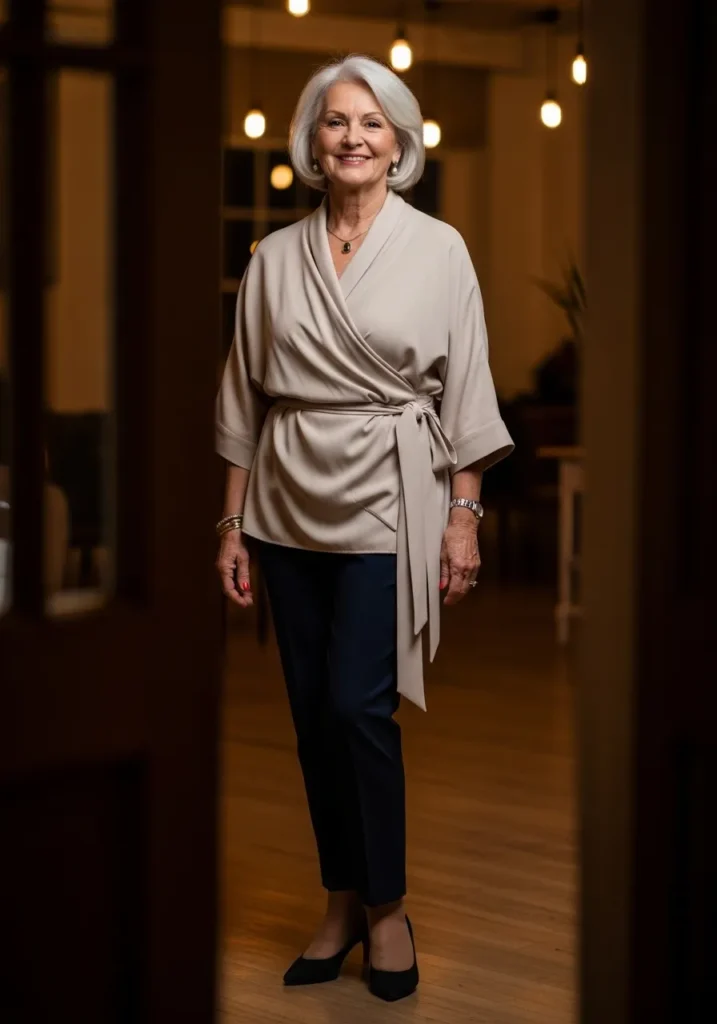The wrap top drapes softly with its taupe shade and gentle tie at the waist. The three quarter sleeves keep it elegant. Navy trousers anchor the look with a slim, polished line. Black heels bring a refined finish. The outfit feels modern and thoughtful.