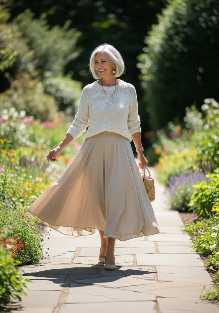The cream sweater feels warm and delicate with its soft knit texture. The beige skirt moves beautifully with its full, flowing silhouette. Nude heels and layered necklaces add subtle elegance. The woven bag keeps it sweet and natural. The outfit feels dreamy and light.