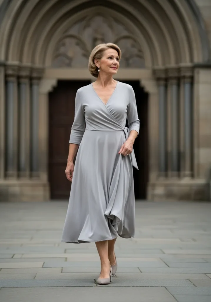 The gray wrap dress flows with a soft drape that skims rather than clings. The three quarter sleeves and V neckline create a clean, graceful shape. Matching heels keep the tone polished and smooth. The fabric moves with a refined ease and the result feels serene and elegant.