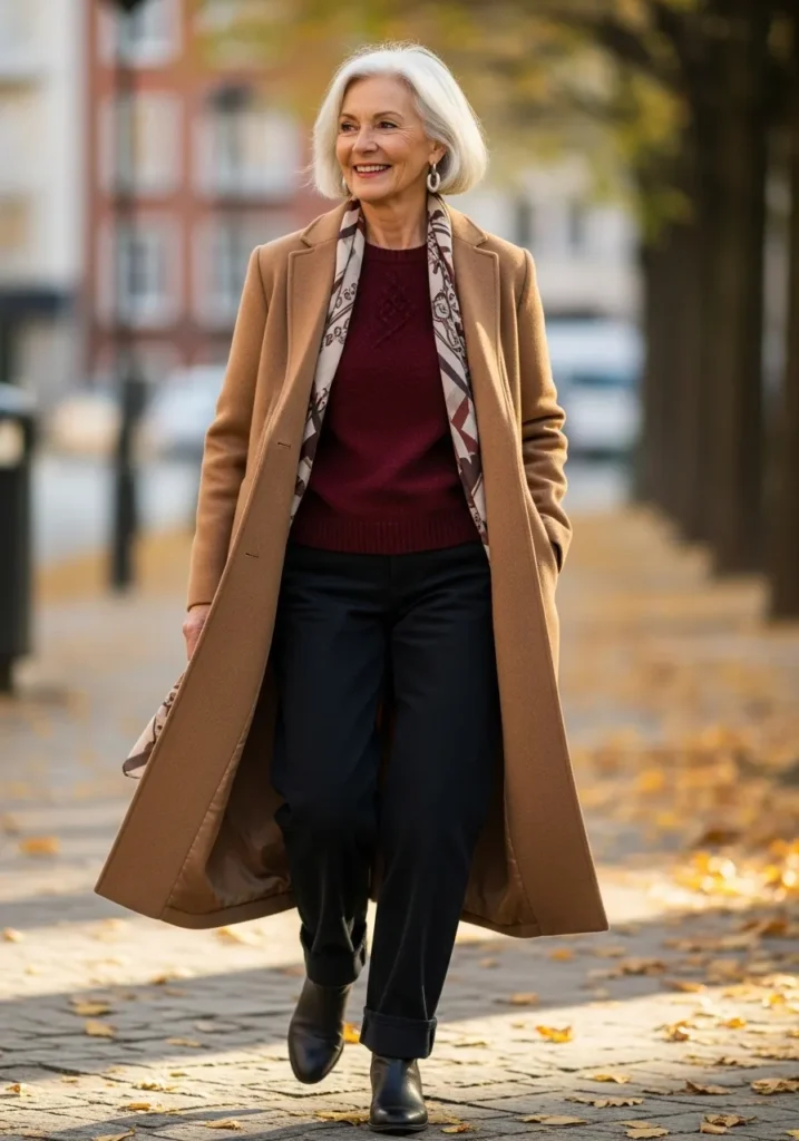 A rich camel coat creates a warm outer layer over a burgundy knit that feels deep and inviting. The printed scarf adds pattern and ties the tones together. Dark trousers and black boots keep everything grounded. The fabrics blend softness with structure which gives the look a smart finish.