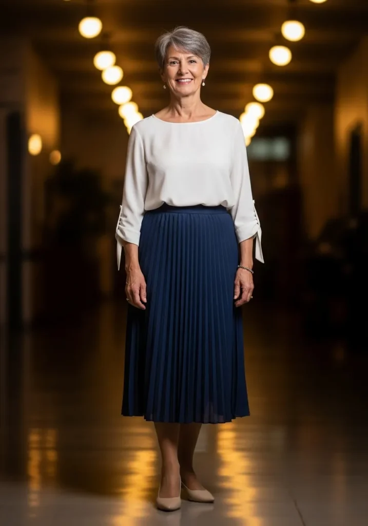 The pleated skirt brings movement and elegance in a deep navy tone. A soft cream blouse adds lightness with its gentle sleeves and relaxed fit. Nude heels complete the look with a subtle touch. The outfit feels graceful and classic with fabrics that fall smoothly.