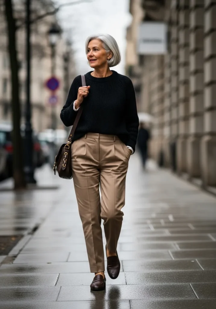The black knit sweater adds a classic layer of softness while the tailored beige trousers keep the look crisp. The high waist and clean pleats give the pants a sharp line that balances the cozy top. Brown loafers and a structured shoulder bag finish the look in a very timeless way. Everything feels polished yet relaxed.