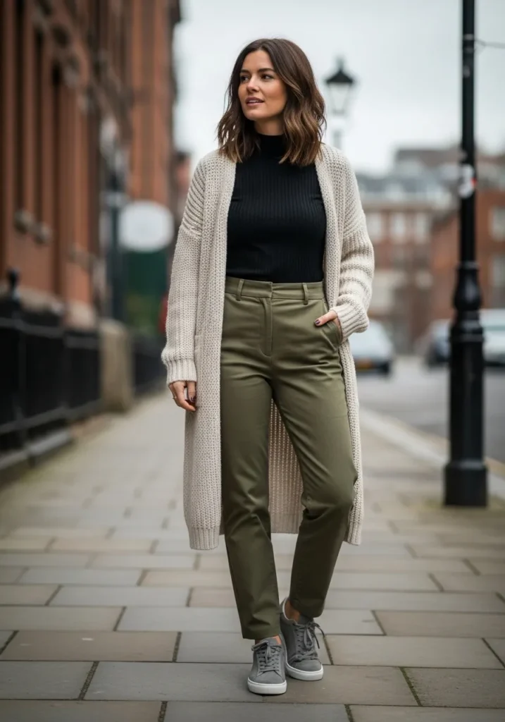 A ribbed black top sets the base while olive trousers add structure and color. The long cream cardigan softens everything with its cozy texture. Grey sneakers blend right in and keep the outfit steady and comfortable for a full Sunday.