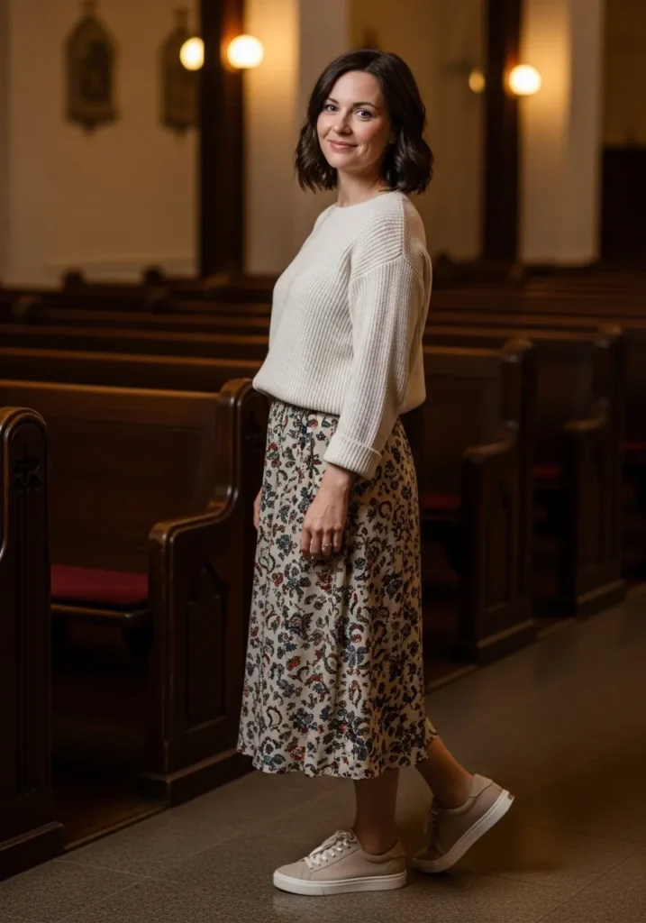 I love how this pairing balances comfort and style. The sweater feels snug without being heavy and the skirt brings a touch of grace. Sneakers make the whole thing easy to wear which always matters on long church mornings.