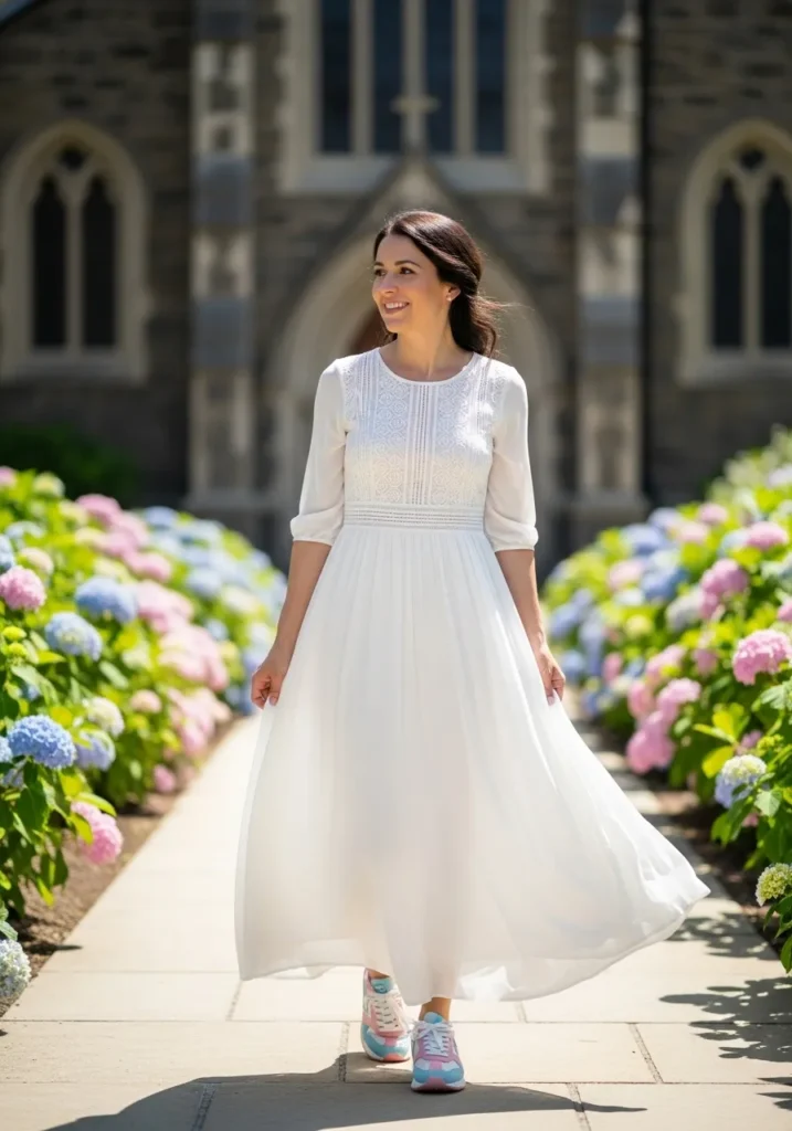 A dreamy white maxi dress floats with every step thanks to its lightweight fabric and delicate texture on the bodice. The pastel sneakers add a fun surprise with soft pops of color that brighten the look. The mix feels fresh and sweet for spring or summer.