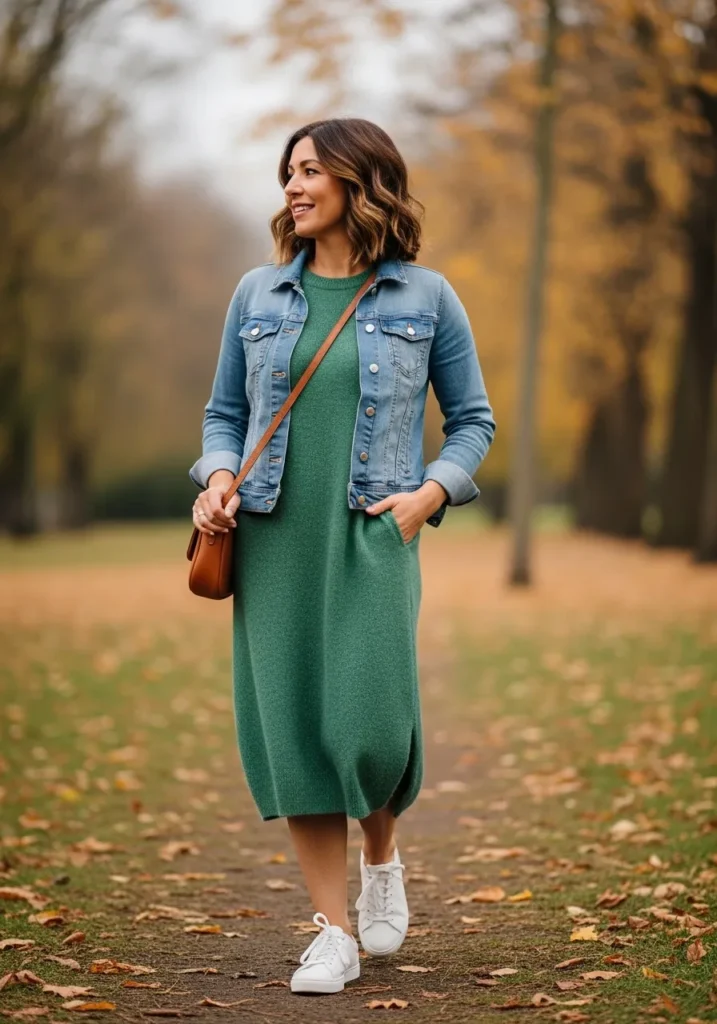A cozy green sweater dress sets the tone while the light denim jacket adds a casual layer that feels perfect for a crisp morning. The brown crossbody bag gives a warm contrast and the white sneakers keep everything relaxed and easy to move in. The whole outfit feels simple and pretty with just the right hint of autumn charm.