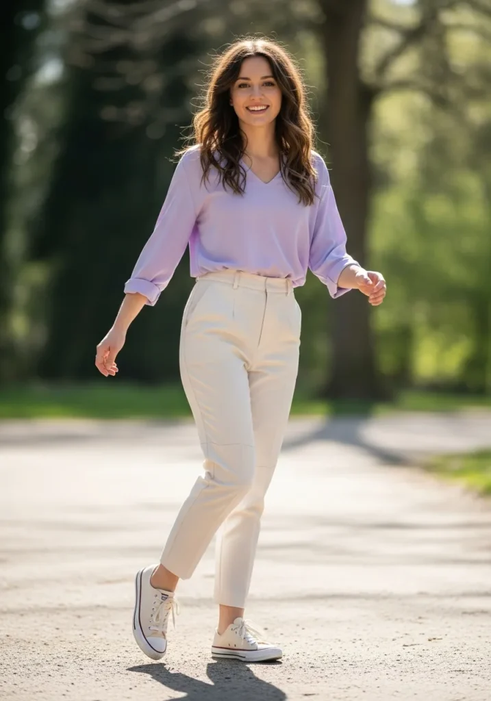 A lilac blouse adds a gentle splash of color while the cream trousers keep the outfit clean and bright. The rolled sleeves give it an easy energy and the classic sneakers make everything look fresh. It is light and lovely for spring or early summer.