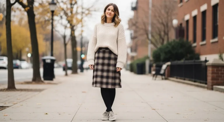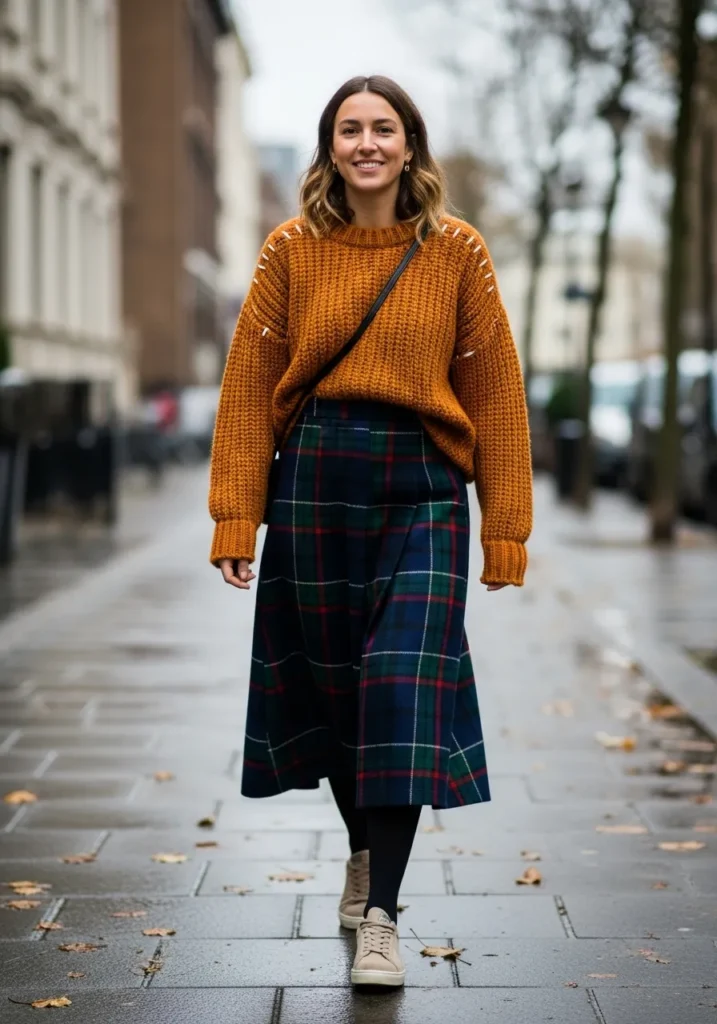 A chunky mustard sweater becomes the star of the look with its warm texture. The tartan midi skirt brings pattern and depth while the neutral sneakers keep things steady. The mix feels cozy and bold in the best fall friendly way.