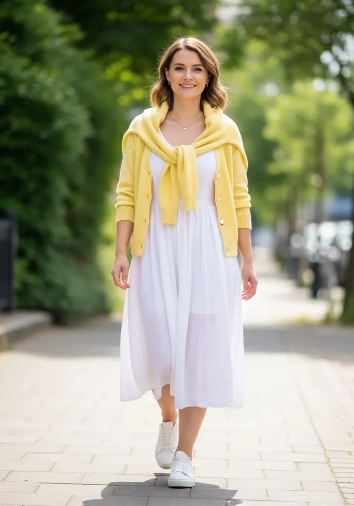 A breezy white dress sets a soft base while the yellow cardigan brightens the entire outfit. Tying the sweater around the shoulders adds a playful preppy vibe and the white sneakers keep it clean and comfortable. The look feels sunny even on a cloudy morning.