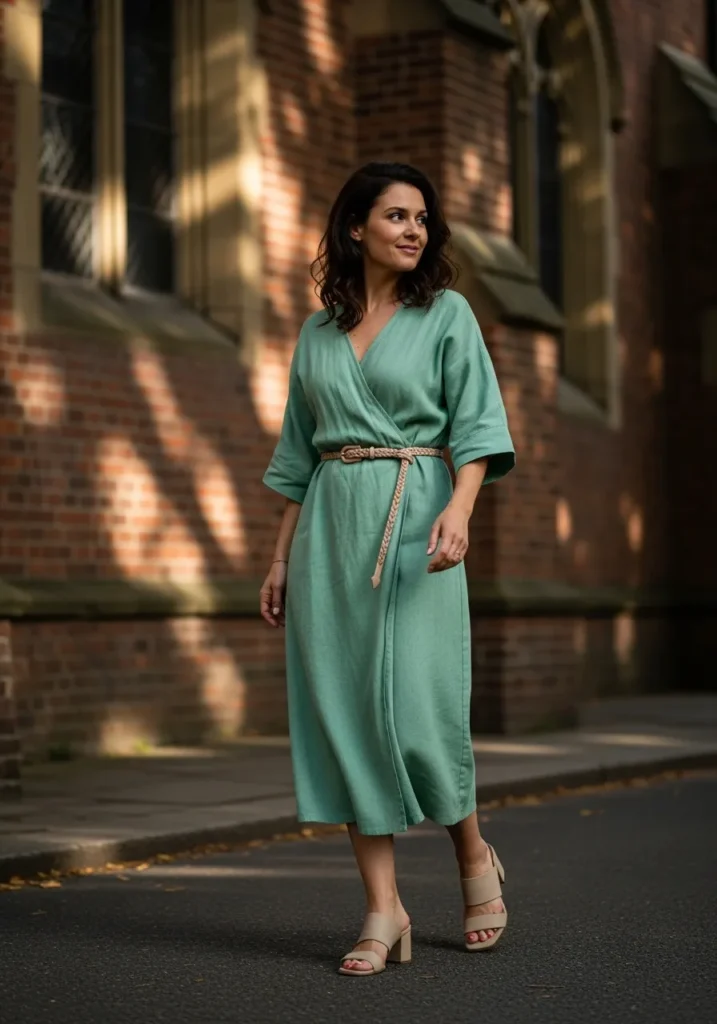 The outfit shows a calm pastel green wrap dress with a relaxed sleeve and a braided rope belt that gives the waist a sweet hint of shape. The fabric looks soft and easy to wear while the sandals keep the look light and warm-weather friendly. The whole style feels fresh and perfect for a gentle spring mood.
