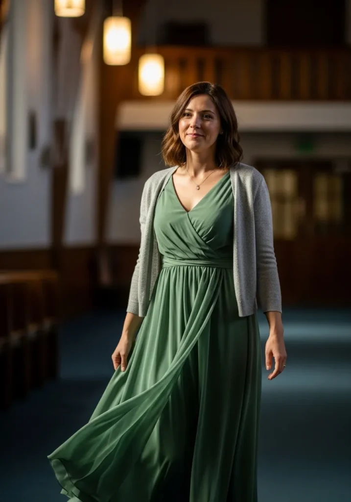 The look features a flowing green maxi dress with a wrap style bodice and a soft draped skirt. A light gray cardigan adds a cozy layer that fits nicely with a church setting. The soft lighting enhances the peaceful tone of the outfit.